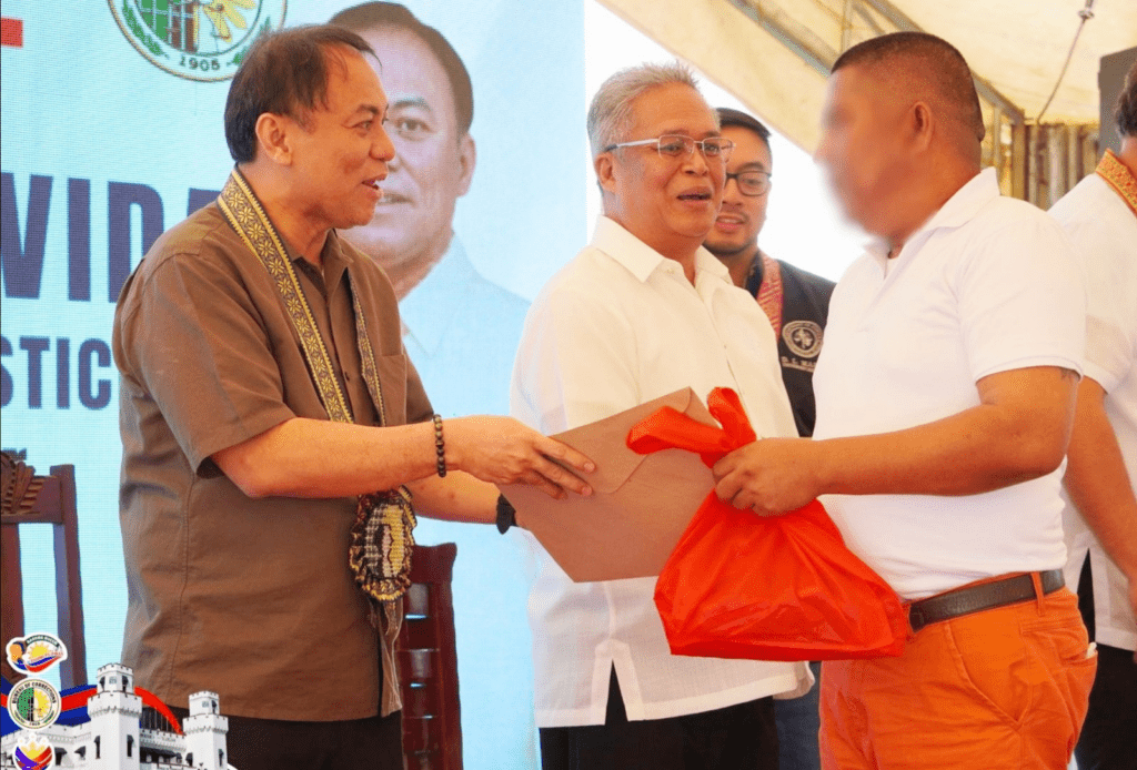 Acting Justice Secretary Fredderick Vida (left) hands documents to a freed inmate of New Bilibid Prison in Muntinlupa City on Saturday (March 28, 2026). A total of 1,239 persons deprived of liberty have been released from Feb. 14 to March 28 because of Good Conduct Time Allowance, acquittal, probation, expiration of sentence, parole or writs of habeas corpus. (Photo courtesy of BuCor-PIO)