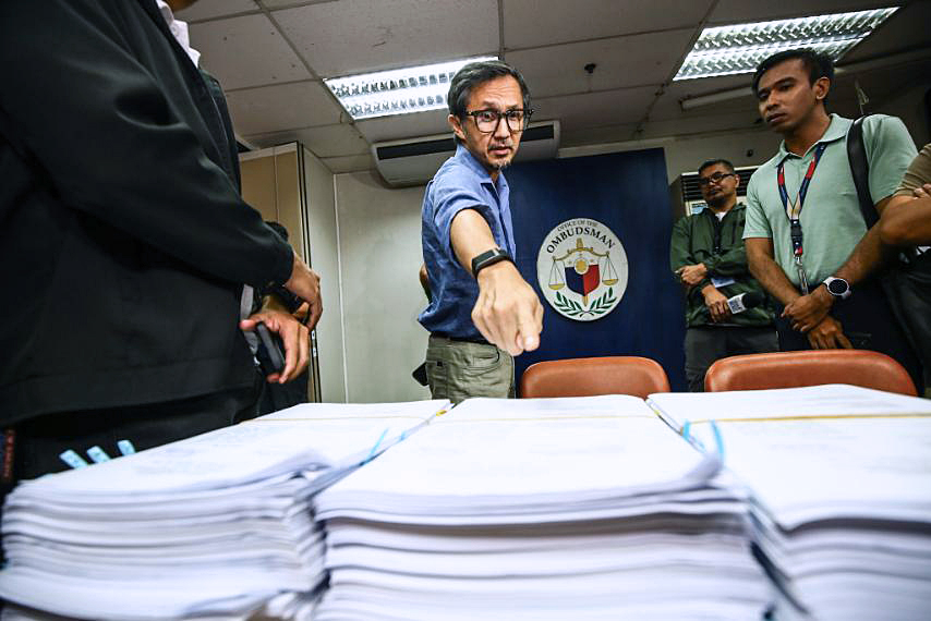 Department of Public Works and Highways Secretary Vince Dizon points to case documents filed against 20 past and current DPWH officials and employees, as well as private contractors, before the Office of the Ombudsman in Quezon City on Thursday (Sept. 11, 2025). The charges are in connection with alleged anomalous flood control projects. (PNA photo by Joan Bondoc)