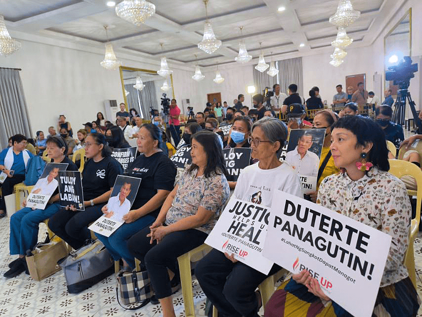 Families of victims of alleged extrajudicial killings gather at Atencio-Libunao Hall of the University of the Philippines Diliman in Quezon City on Wednesday (April 22, 2026) to watch a livestream of the International Criminal Court proceedings. The Appeals Chamber affirmed the Oct. 28, 2025 decision that rejected former president Rodrigo Duterte’s challenge to the jurisdiction of ICC in handling his cases, thus the request for his immediate and unconditional release is moot. (PNA photo by Joan Bondoc)