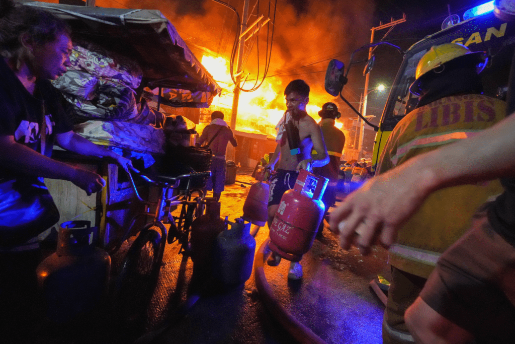 A resident carries liquefied petroleum gas (LPG) tanks away from burning homes along NIA Road, Barangay Pinyahan in Quezon City early Saturday (March 7, 2026) as firefighters respond to a blaze that began at about 9 p.m. Friday (March 6). The fire reached Task Force Bravo, and its cause is still under investigation. (PNA photo by Robert Oswald P. Alfiler)