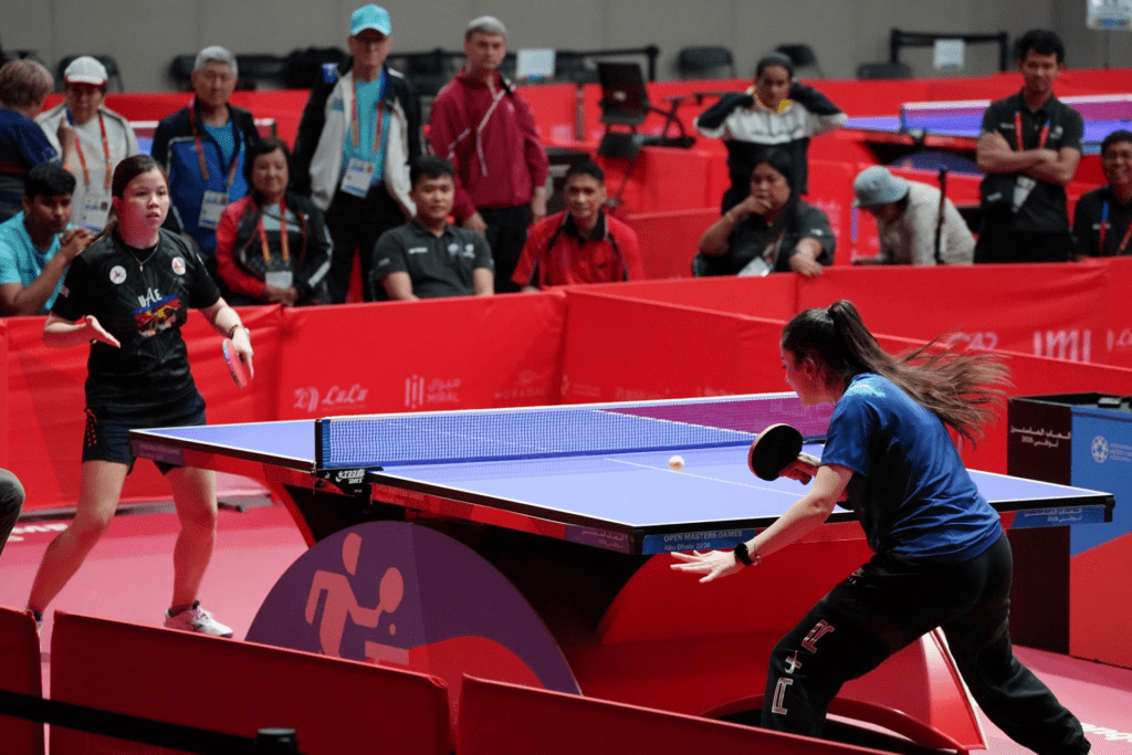 The Philippines’ Jenet Rodriguez (left) waits for the return of Syria’s Samaar Al Hafe in their women’s table tennis 30+ final at the Open Masters Games Abu Dhabi National Exhibition Center in the United Arab Emirates on Saturday night (Feb. 14, 2026). Rodriguez took the gold with a 13-15, 11-6, 11-7, 12-10 victory. (PNA photo by Avito Dalan)